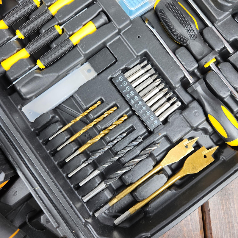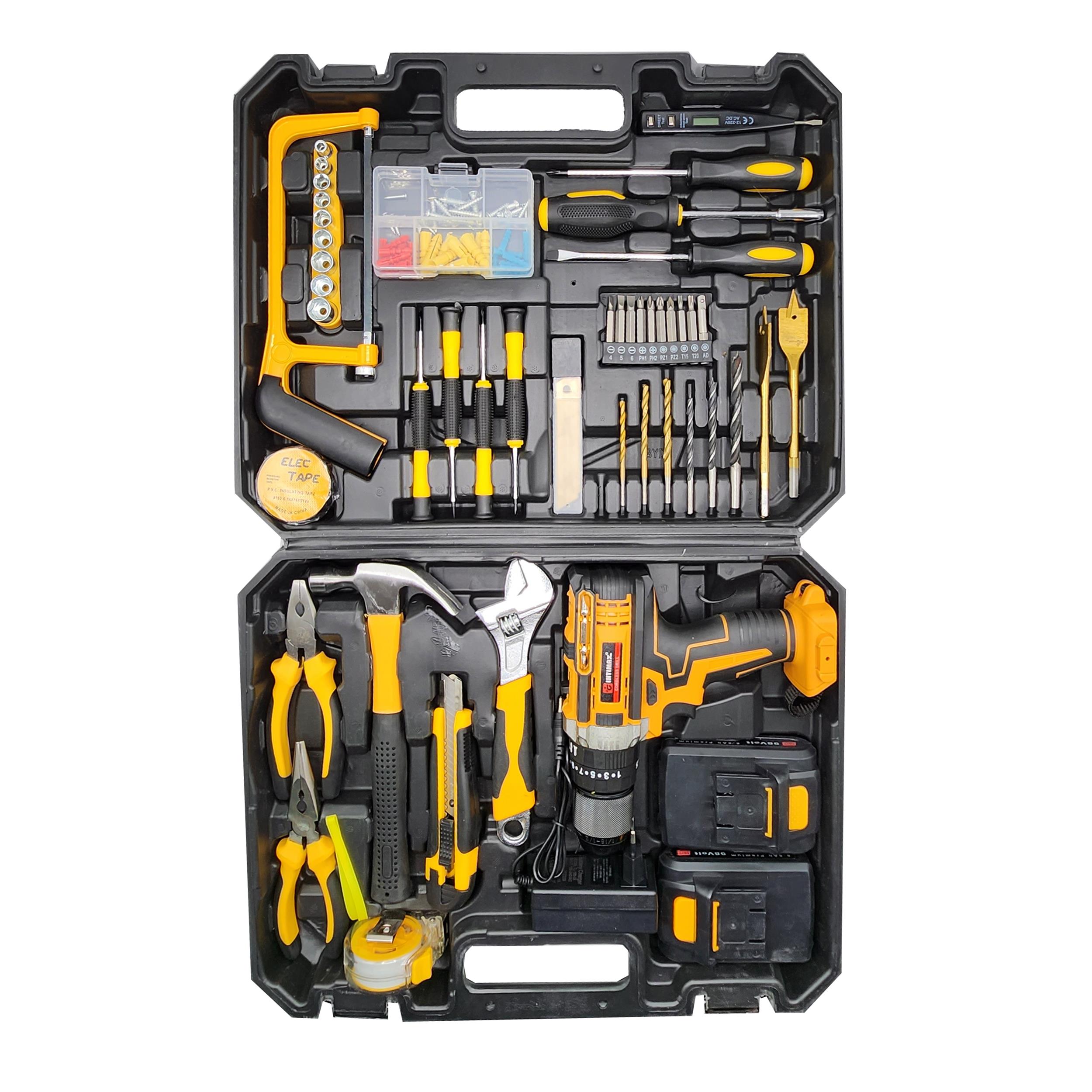 آچار فرانسه سایز ۸، انبردست، دمباریک، چکش، بکس تک سایز ۴ تا ۱۳ میلیمتر، متر ۳ متری، پیچ گوشتی دوسو و چهارسو سایز بزرگ، مته آهن سایز ۳، ۴ و ۵ ، مته چوب سایز ۳، ۴ ،۵ میلیمتر، مته برگی سایز ۱۶ و ۲۰ ، دارای ۹ عدد نوک پیچ گوشتی، تبدیل نوک پیچ گوشتی به بکس، چسب برق، کاتر، فازمتر دیجیتال، ۵ عدد تیغ کاتر، دو سایز پیچ گوشتی موبایلی دو سو و دو سایز پیچ گوشتی موبایلی چهارسو، کمان اره چوب و فلز، مجموعه سایزبندی پیچ و رولپلاک می باشدکیفیت عالی می باشد.