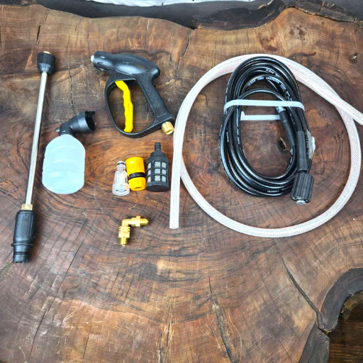 🔸 دارای تفتگی قابل تنظیم، میله بلند نازل، شلنگ فشار قوی، شلنگ معمولی، بطری شوینده، یک عدد